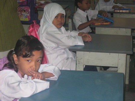Kelas sementara untuk Yasmin. Hari ini saja ada ujian diagnostik(betul ke ejaan ni?). Aku dah siap pesan dengan Yasmin jawab betul2, jangan main hentam aje...Aku nak ambil gambar nama dia yang tertera kat pintu tu, tapi tak jelas pulak. Aku nak tunjukkan yang pihak sekolah tersalah tulis nama bapa dia. Instead of Yasmin Zahirah bt Mohd Zulkifli, dia orang tulis Yasmin Zahirah bt Md Ali...hehehe...Md Ali tu Tok Aji dia, iaitu arwah bapak aku. Tu yang Eimran duk kata adik bongsu aku nak masuk sekolah...hahaha...